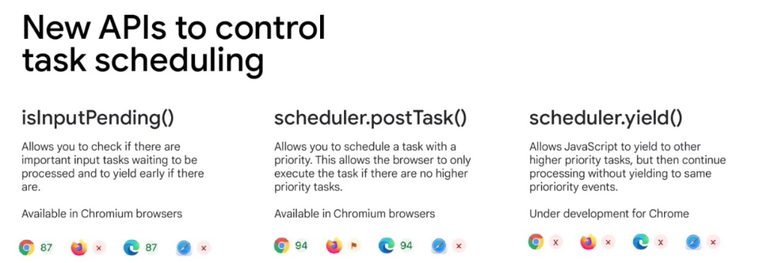 还有一些新的和即将推出的浏览器 API ,如 isInputPending、scheduler.postTask 和 scheduler.yield,它们可以帮助大家决定何时以及如何放弃主线程。有关更多详细的信息,可以去看 web.dev 上优化长任务的相关文章 :https://web.dev/optimize-long-tasks/ 。另外,在 Google I/O 上,还有一个专门关于优化长任务的独立演讲。