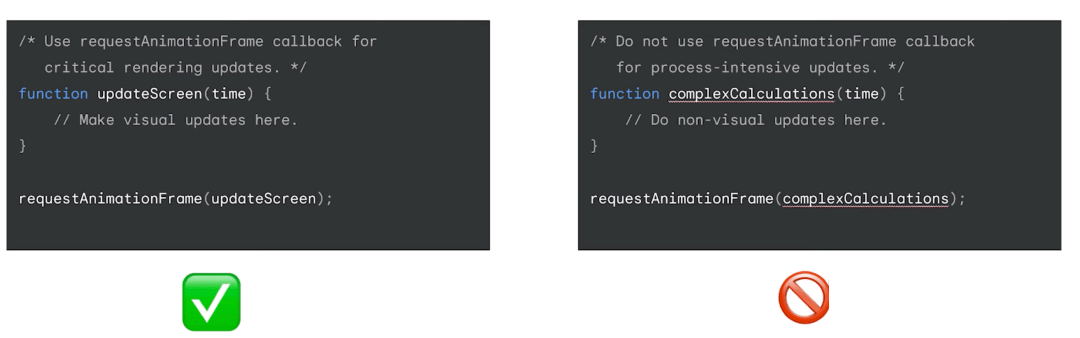 最后,大家应该避免滥用 requestAnimationFrame API,它应应该只用于关键的渲染工作,如果通过这个 API 安排了过多的工作,它会导致渲染变慢。