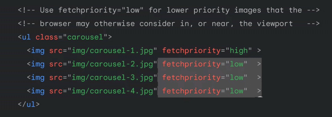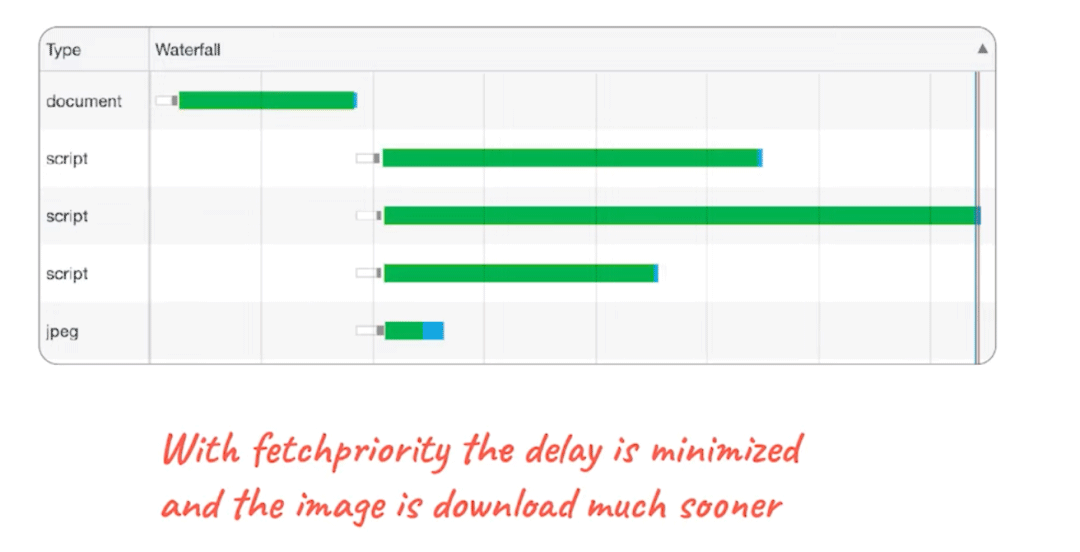 回到之前的例子,我们解决了图片可尽早被发现的问题,但是请求图像和开始下载依然会存在很大的延迟。使用 fetch proirity API 可以将延迟最小化,并且让图像尽快下载。
