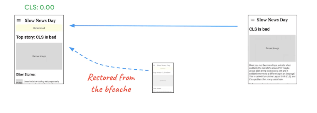 我们去年看到 CLS 的最大改进之一是在 Chrome 中推出的回退缓存或 BF 缓存中。另外,Safari 和 Firefox 也已经上线这个功能一段时间了。