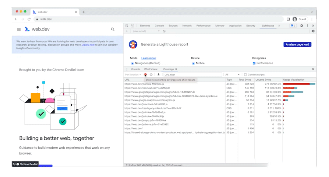 我们可以使用 Chrome Devtools 的 Coverage 特性来查看我们的 JavaScript 有多少被执行了。如果在页面加载期间没有使用的大部分 JavaScript ,都可以考虑进行代码分离以在需要时或浏览器不太繁忙的时候加载这些代码。