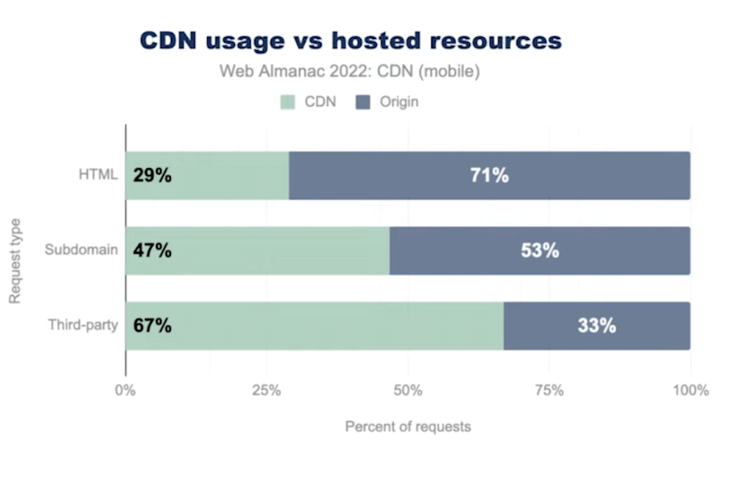 开发者经常使用 CDN 来托管静态资源,如 CSS、JavaScript 或 Media 文件,但是通过 CDN 提供 HTML 也可以获得更多的好处。根据 Web Almanac 的统计结果,只有 29% 的 HTML 文档请求会通过 CDN 服务加载。如果你不是这样做的,那么这意味着你还有很大的机会来优化网站的性能。