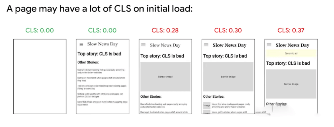 一个页面可能在初始加载时具有很大的 CLS ,因为随着其他内容(如图像和广告)的加载,页面的结构会一直产生变化,从而影响 CLS。当然,我们应该尽量在首屏页面渲染时避免加载这些内容。