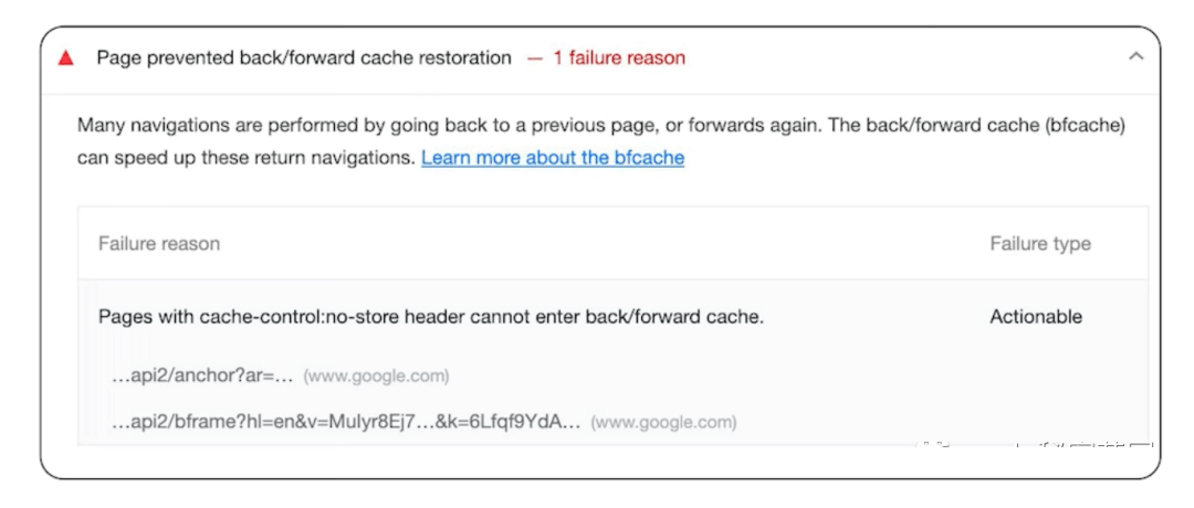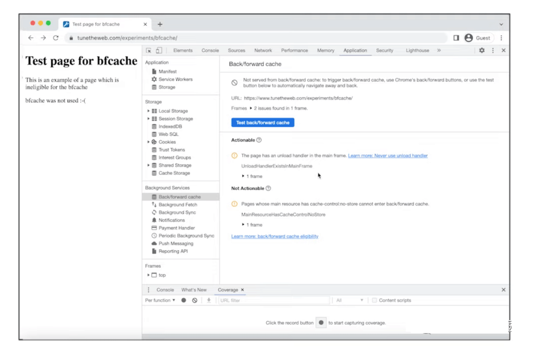 Chrome DevTools 有一个工具,可以让我们测试页面是否有使用 BF Cache 的资格。如果没办法使用 BF Cache ,工具一般都会告诉我们具体原因。最常见的原因是我们设定了 cache-control 这个 Header 的值为 no-storage 或者在页面中使用了 unload handler,这两者都会阻止 BF Cache 的使用。