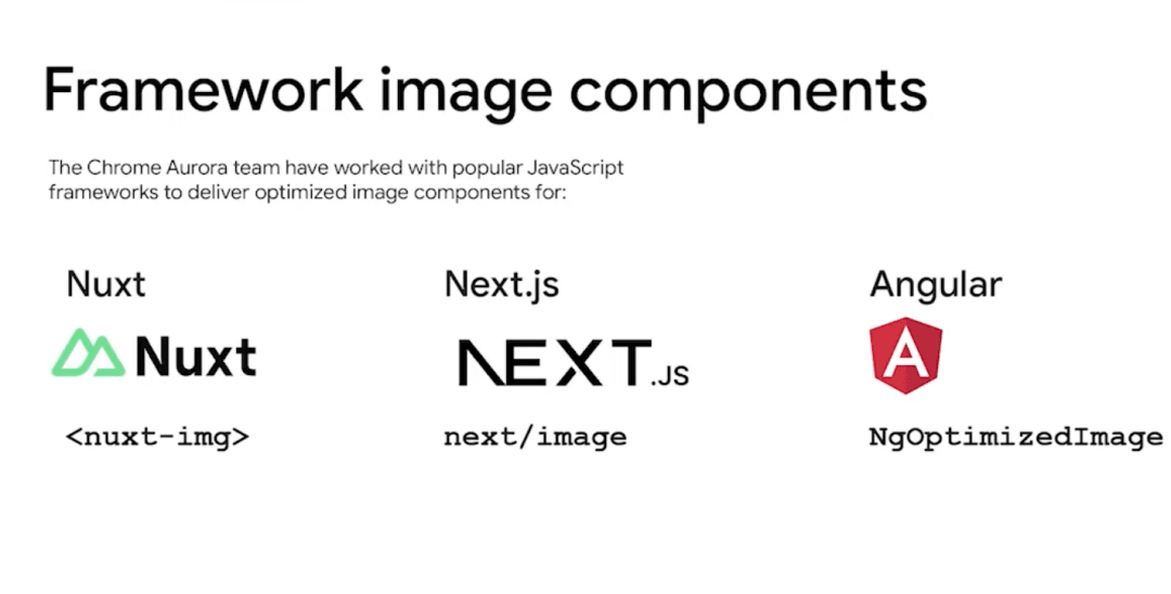 如果我们使用了 JavaScript 框架,建议使用 Chrome Aurora 团队开发的 Image 组件添加图像。其中 Angular 和 XJS 组件已经内置了提取优先级的支持,团队也正在开发 Next.js 的 Image 组件,以支持这个新的 API 。