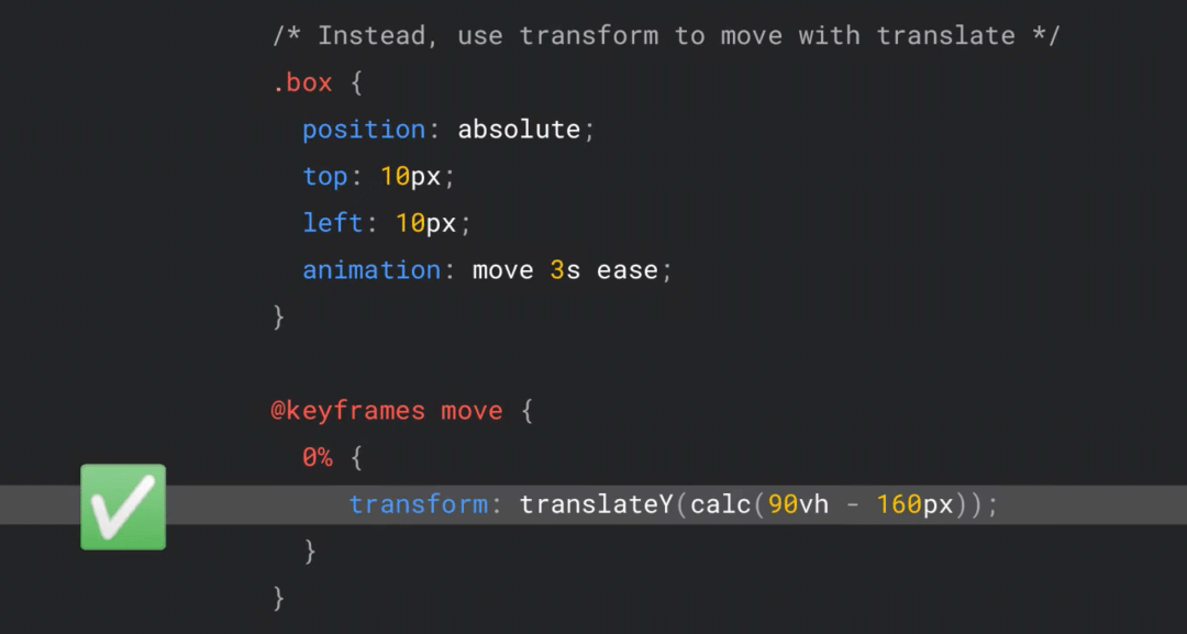 使用 translate 进行相同的动画不会在浏览器的布局处理中移动内容,而是在合成器层中进行的,除了对于浏览器来说工作量较小之外,这还意味着它无法影响其他的内容,这也意味着它对 CLS 的影响就变小了。所以我们的解决方案就是替换使用 top 或 left 的动画,并且这种方式在所有的浏览器中都得到了支持。