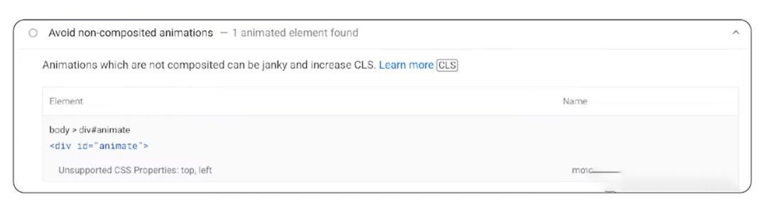 动画的渲染需要浏览器重新布局页面,因此需要更多的工作,即使脱离正常文档流的绝对定位元素,例如使用 top 或 left 移动内容,也会将其计算为布局移位,即使它不会移动任何周围其他的内容,内容本身也在移动,并且有可能影响其他内容,所以这也会影响 CLS。