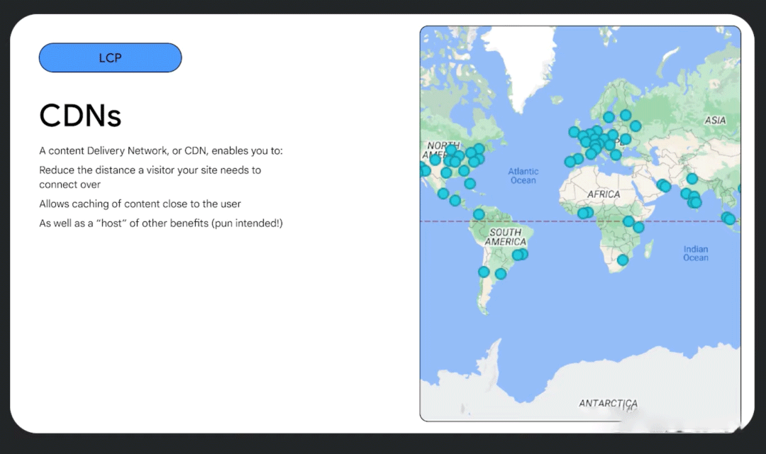 前两个 LCP 的建议是和如何构建 HTML 来让 LCP 资源易于被发现以及优先下载有关,但这都取决于首屏加载 HTML 的速度。所以,最后一个建议是使用 CDN 来优化 First Byte 的时间。